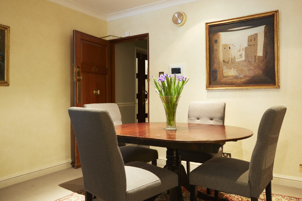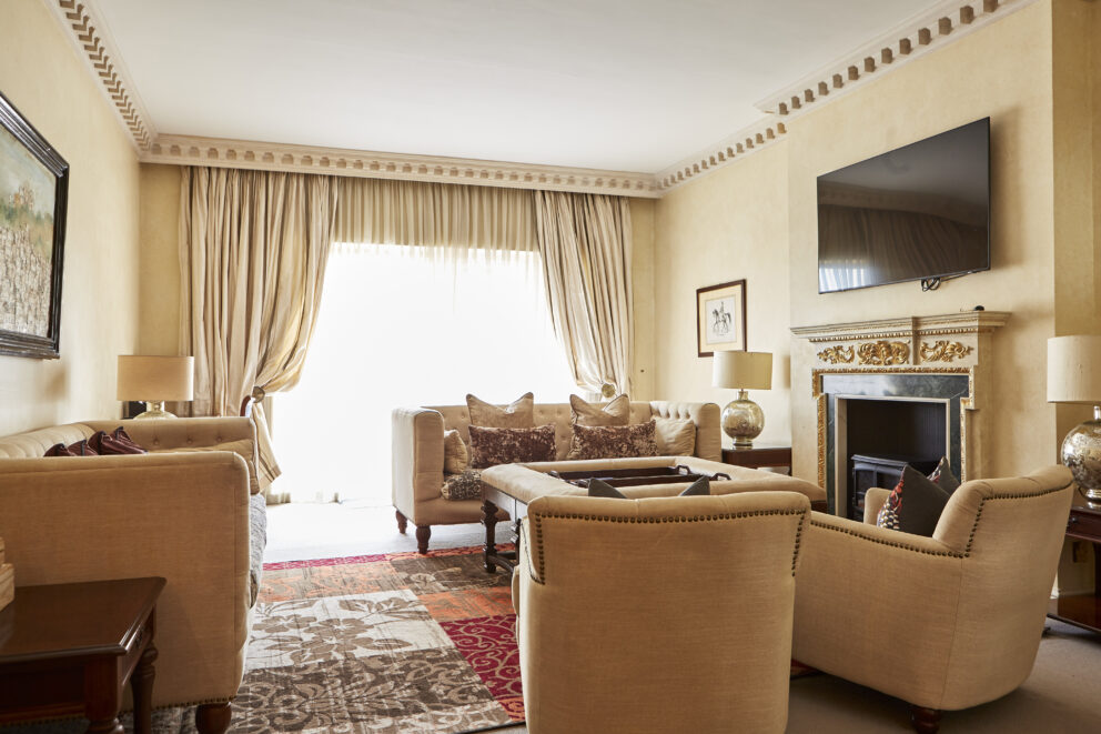 - Sitting room/dining area: the finest furniture and furnishings, dining table seating for four, desk, the latest Samsung 55″ 4K smart TV with Chromecast technology. Sitting room 29 m² (312 ft²). Dining area 11 m² (118 ft²).